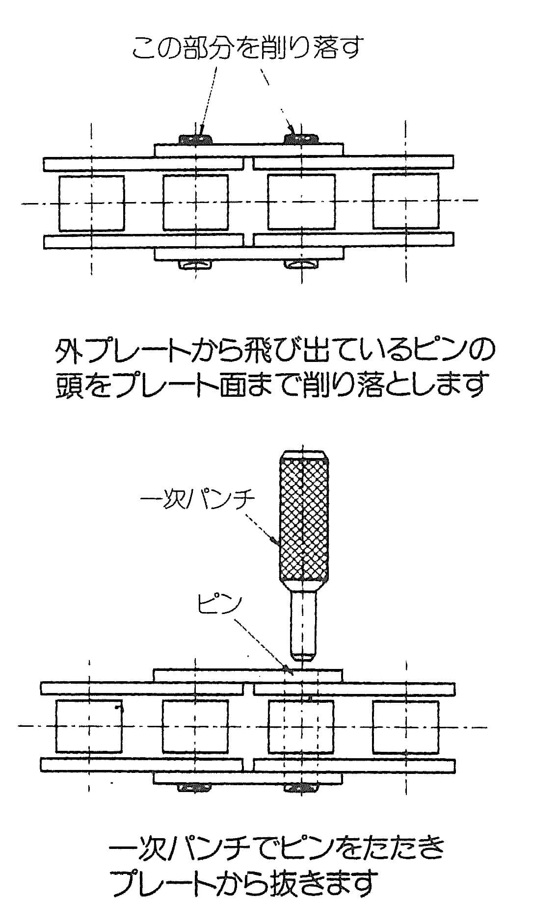 ①リベット形ローラチェーンでは、外リンクの上に飛び出た2本のピンの頭をプレートと同じ面になるまでグラインダーで削り落とします(写真1)。 割りピン形ローラチェーンでは、割りピンを抜きます。